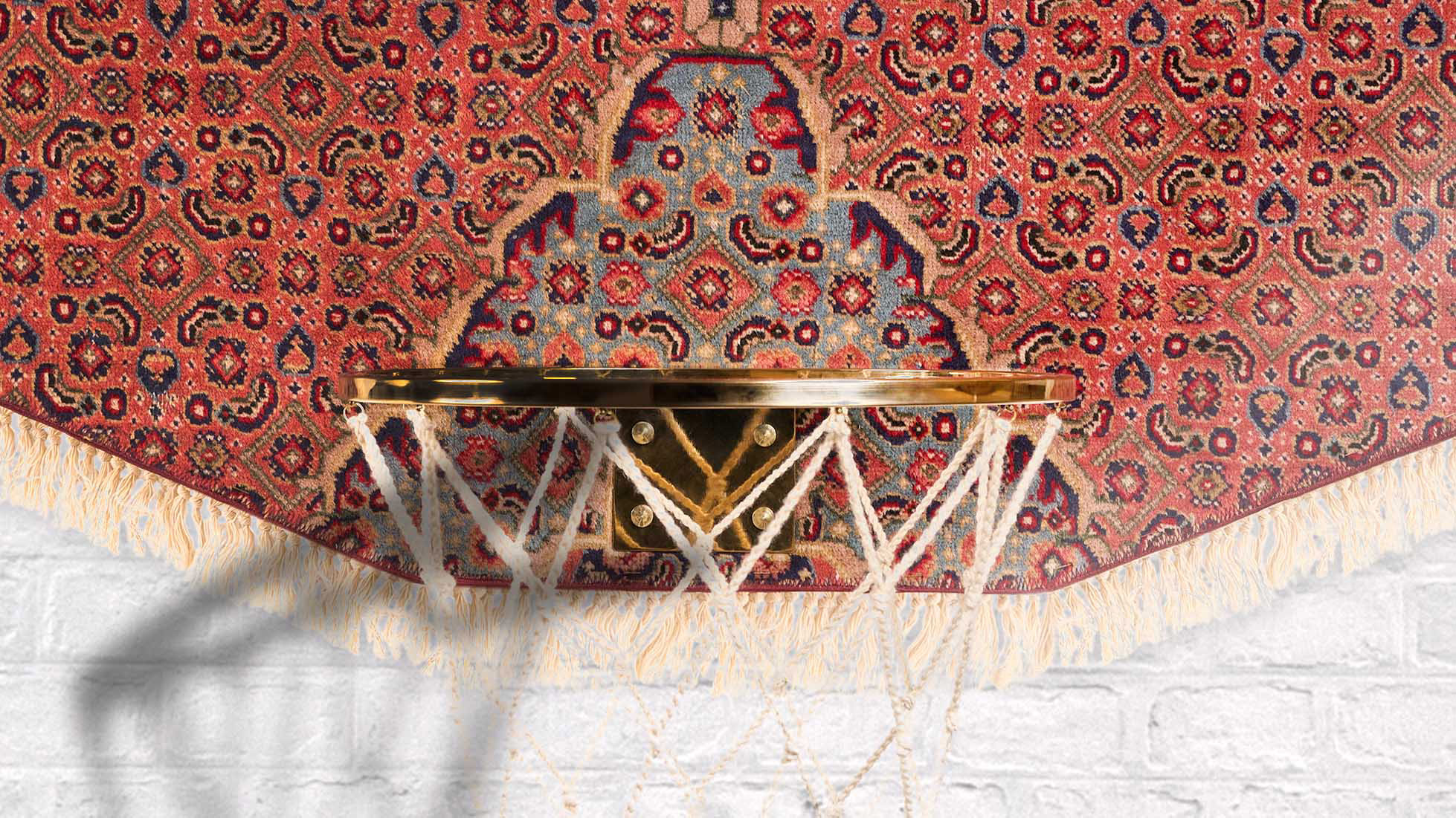For "The Patterned Court," Mohammad Jamshidi draws deep inspiration from the geometric precision and aesthetic richness of Farsh-Bafi to redefine the basketball backboard. This artwork might focus on a particular style of carpet pattern, such as a bold medallion design or an all-over repeating motif, reimagined to fit the backboard's proportions. The application, whether through painting, detailed inlay, or other innovative techniques, aims to evoke the tactile richness and visual depth of a hand-knotted rug. This piece celebrates the intersection of disciplined patterns found in both traditional weaving and strategic play, transforming the backboard into a grand, static tapestry—a visual poem that honors the heritage of design and the enduring spirit of performance.