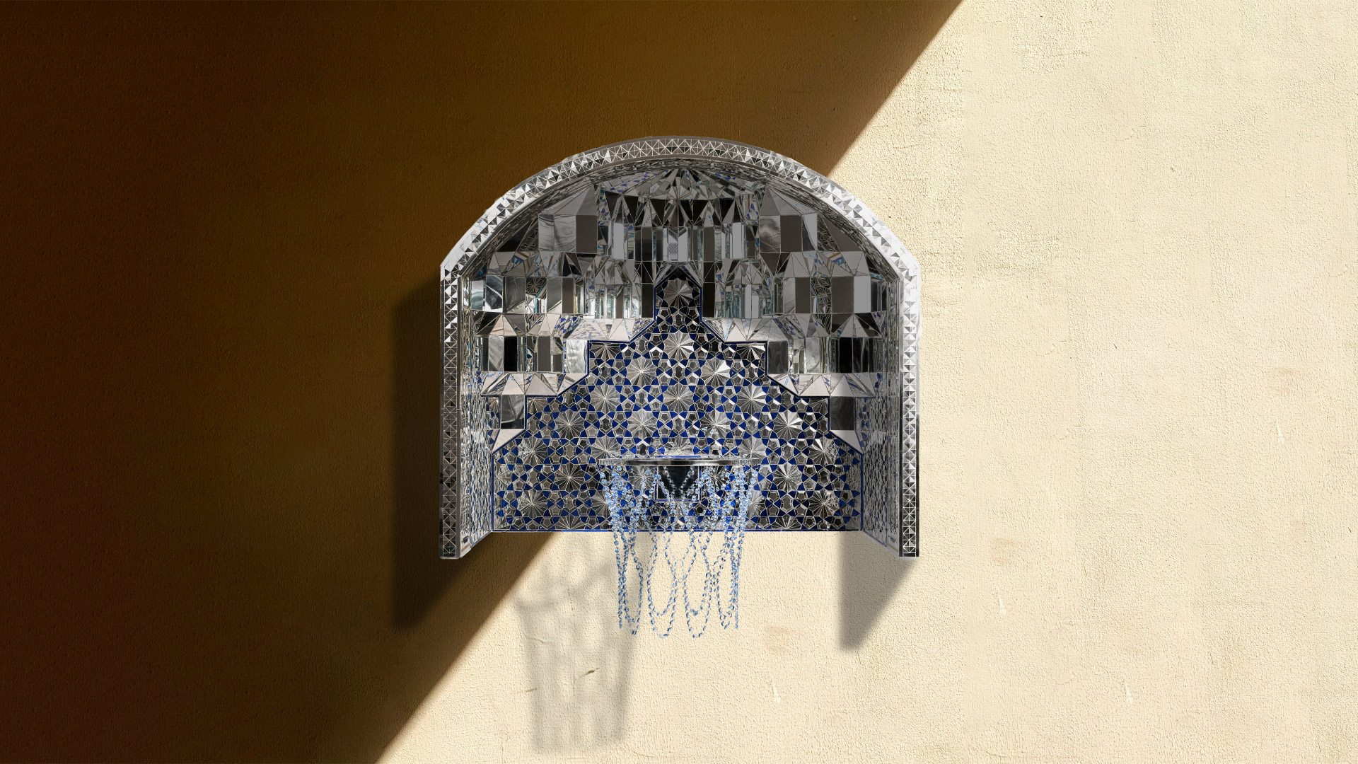 In "Cosmic Harmony," Mohammad Jamshidi brings the celestial grandeur of Muqarnas and the dazzling brilliance of Aineh-Kari to the unexpected canvas of a basketball backboard. Imagine the backboard's structure incorporating elements of Muqarnas, possibly along its frame or as a central design, meticulously adorned with thousands of precisely cut mirror pieces. This piece transforms the backboard into a miniature architectural marvel, a fragmented dome of light that evokes the vastness of the cosmos and the intricate beauty of traditional design. It's a breathtaking convergence of disciplined form and infinite reflection, where the raw power of sport meets the sublime elegance of Persian artistic heritage.