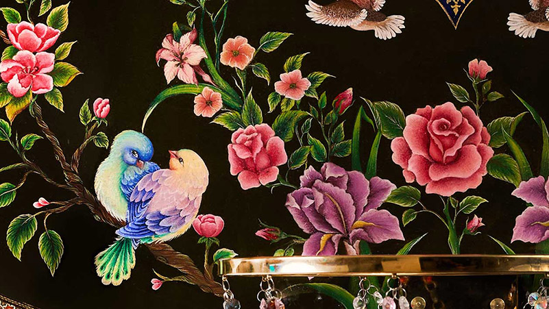 For "Visionary Narrative," Mohammad Jamshidi challenges the traditional scale of Negargari by expanding its intricate beauty onto the grand, unexpected stage of a basketball backboard. This particular piece might focus on an expansive, dreamlike scene, using the backboard's surface to unfold a broader narrative or a more abstract interpretation of a traditional miniature theme. The juxtaposition of the backboard's functional robustness with the delicate, storytelling essence of Negargari creates a powerful visual paradox, transforming a sporting icon into a sweeping canvas for ancient tales and contemporary vision.