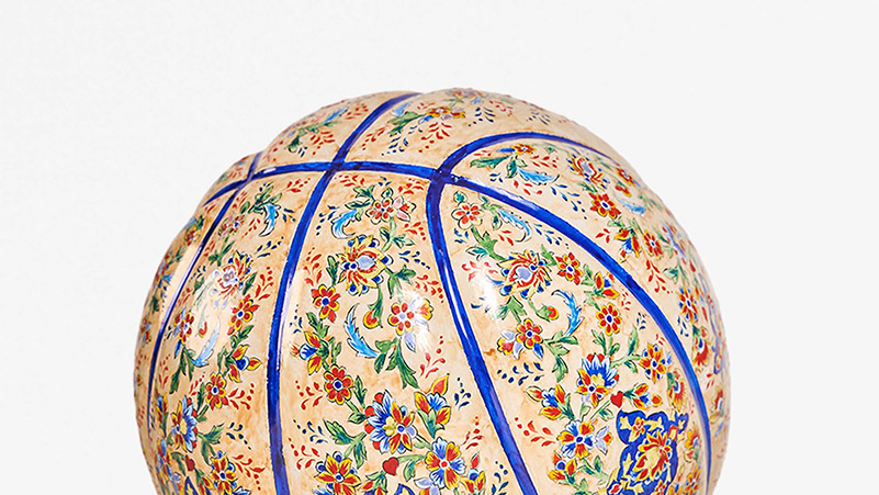 In "Enamel Bloom Sphere," Mohammad Jamshidi embraces the challenging curvature of a basketball to showcase the dazzling beauty of Minakari. The entire surface of the ball becomes a canvas for an intricate enamel design, perhaps a swirling floral pattern or a mosaic of traditional motifs that seem to bloom across the sphere. The glossy, vibrant finish of the enamel catches and refracts light as the ball moves, creating a constantly shifting spectacle of color and pattern. This piece is a radiant testament to precision and vibrancy, merging the dynamic energy of the game with the timeless, luminous elegance of a cherished Persian art form, making the ball a precious, handheld orb of color.